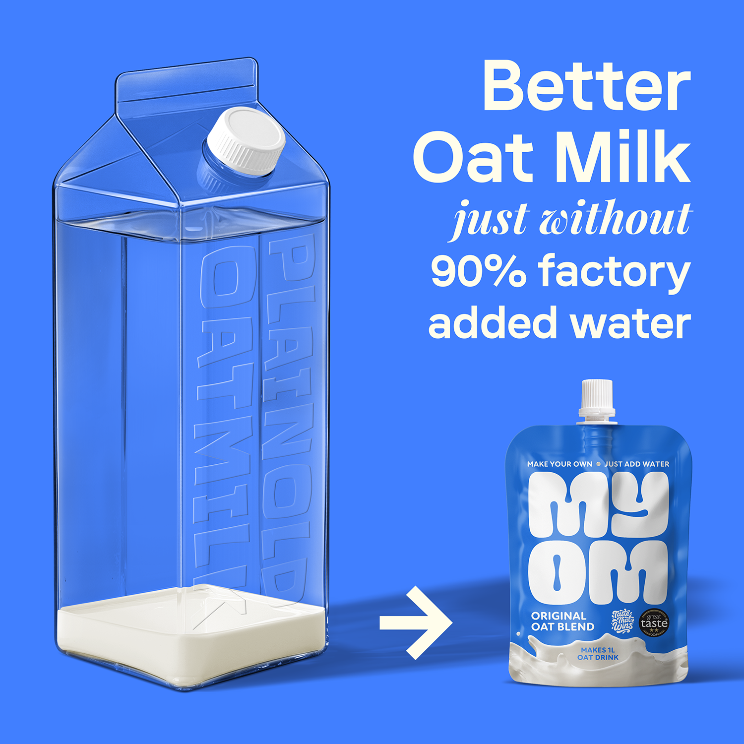 Carton oat milk, brands like Oatly, Alpro, and Minor Figures, is typically 90% water. That water is added at the factory, packed into cartons, and trucked around the country every week. MYOM does the opposite. You add the water at home.