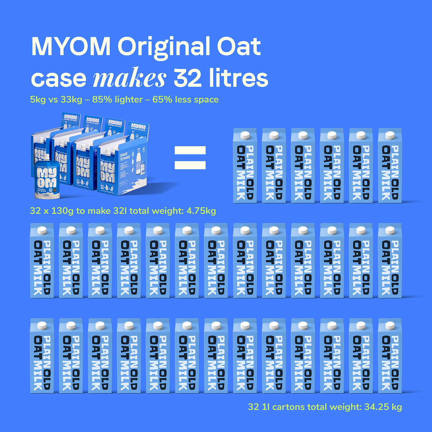 MYOM does the opposite. You add the water at home. The result is oat milk that works exactly the way you expect it to. Make a little. Make a litre. Use it fresh. Nothing clever. Nothing specialist. Just everyday oat milk, without the cartons.