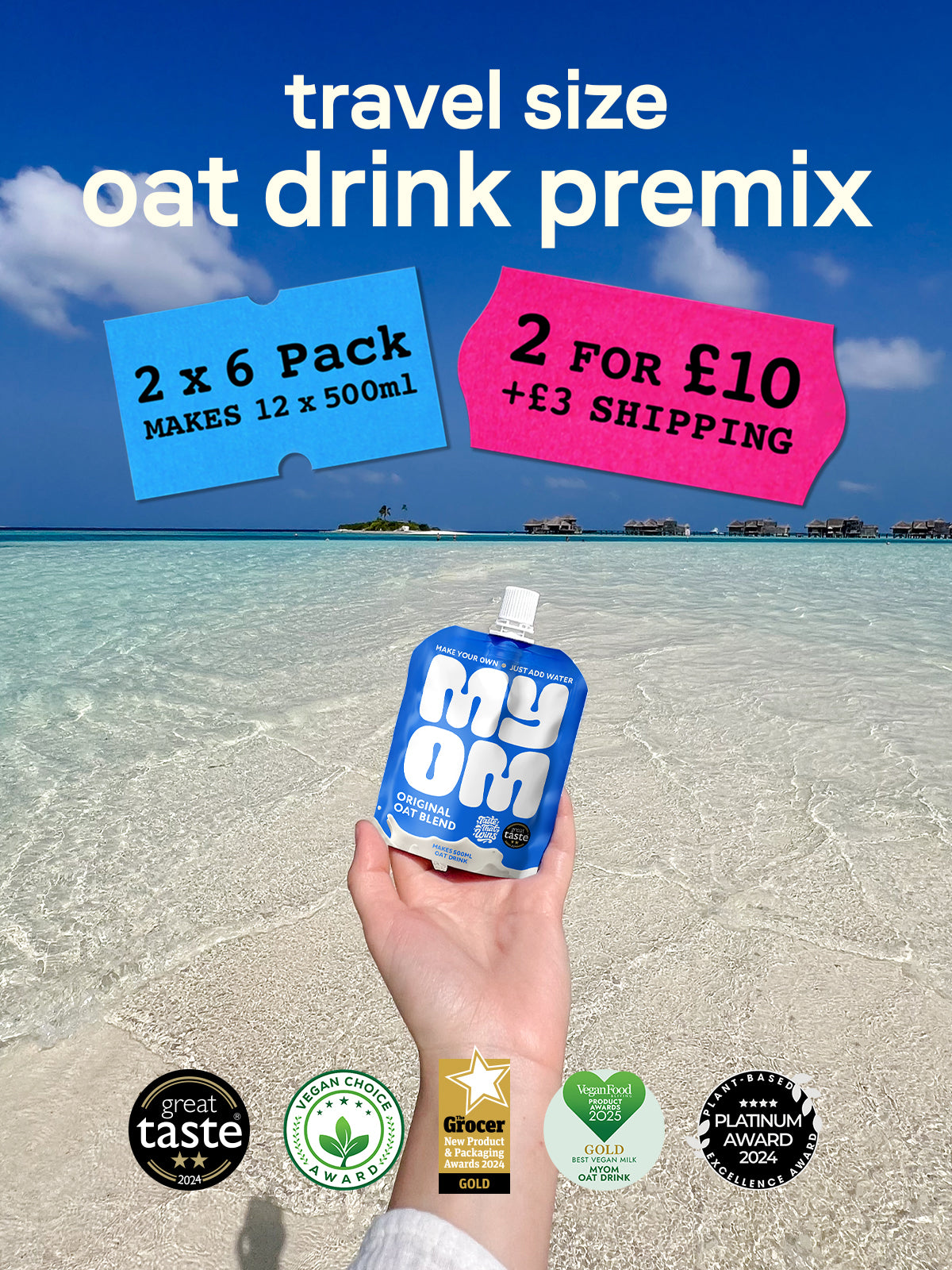 To make 500ml of MYOM: add 240ml water into a clean 500ml bottle. Squeeze in a 65g pouch of MYOM Oat Blend and shake well for 30 seconds. Top up with a further 200ml of water and shake again. If you want to use a blender, add the MYOM Oat Blend to 440ml water and blend for 30 seconds before pouring into a clean bottle.