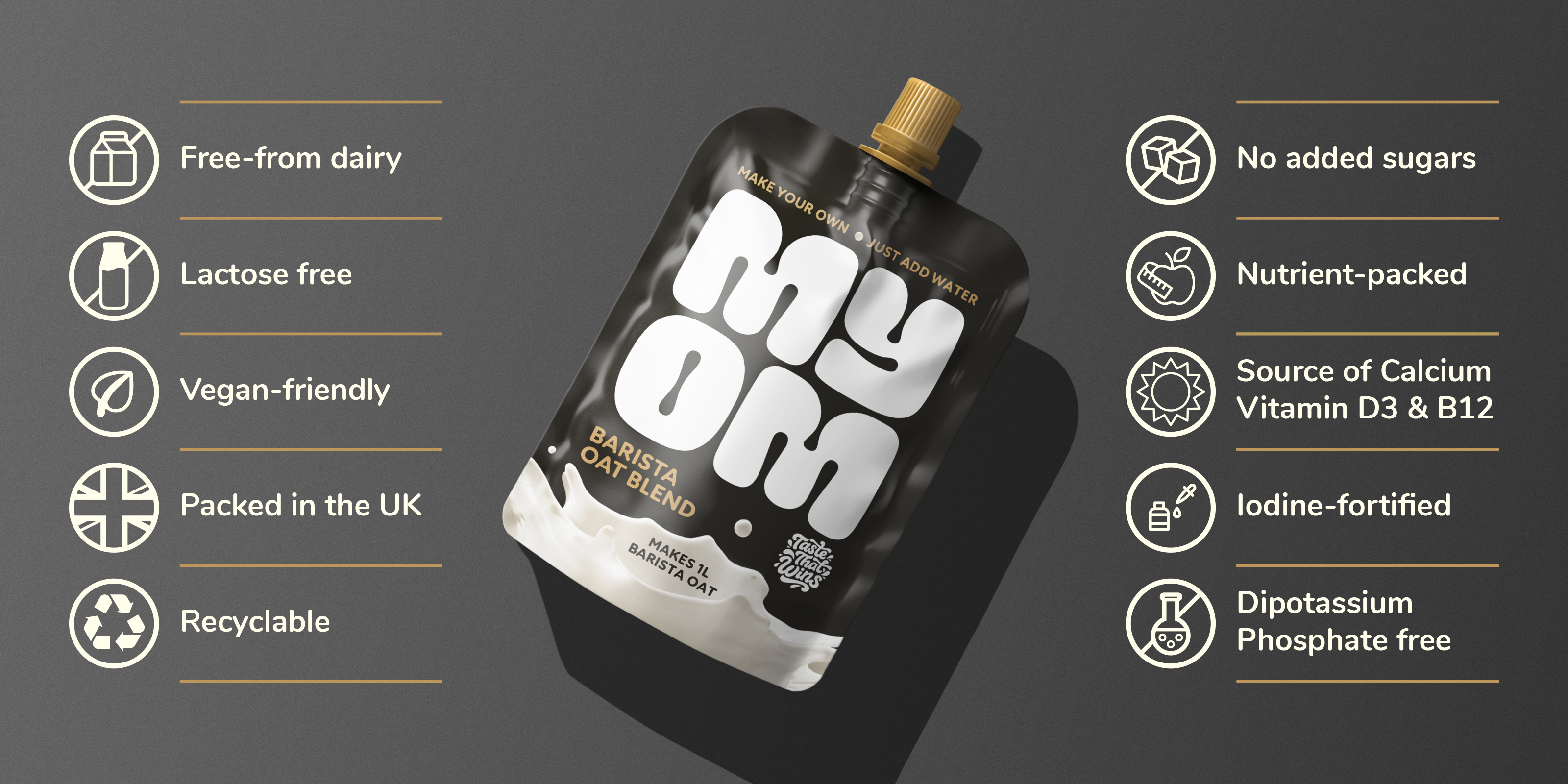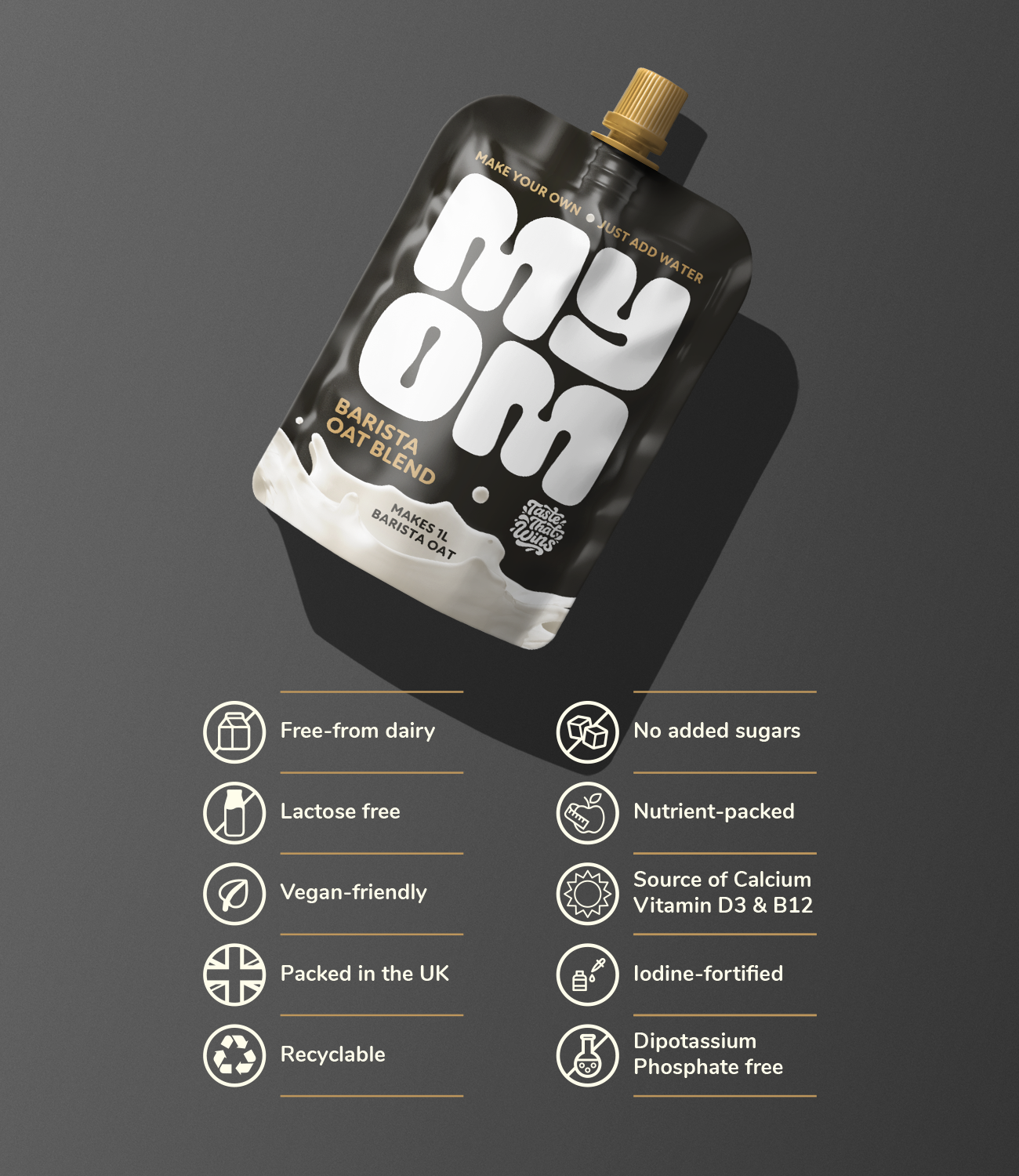 Each 130 g pouch replaces a one-litre carton, cutting packaging by 87% and transport emissions. Made in Scotland, MYOM Barista Oat combines café-quality taste with a cleaner label and a smaller environmental impact: a premium barista milk that tastes better and wastes less.