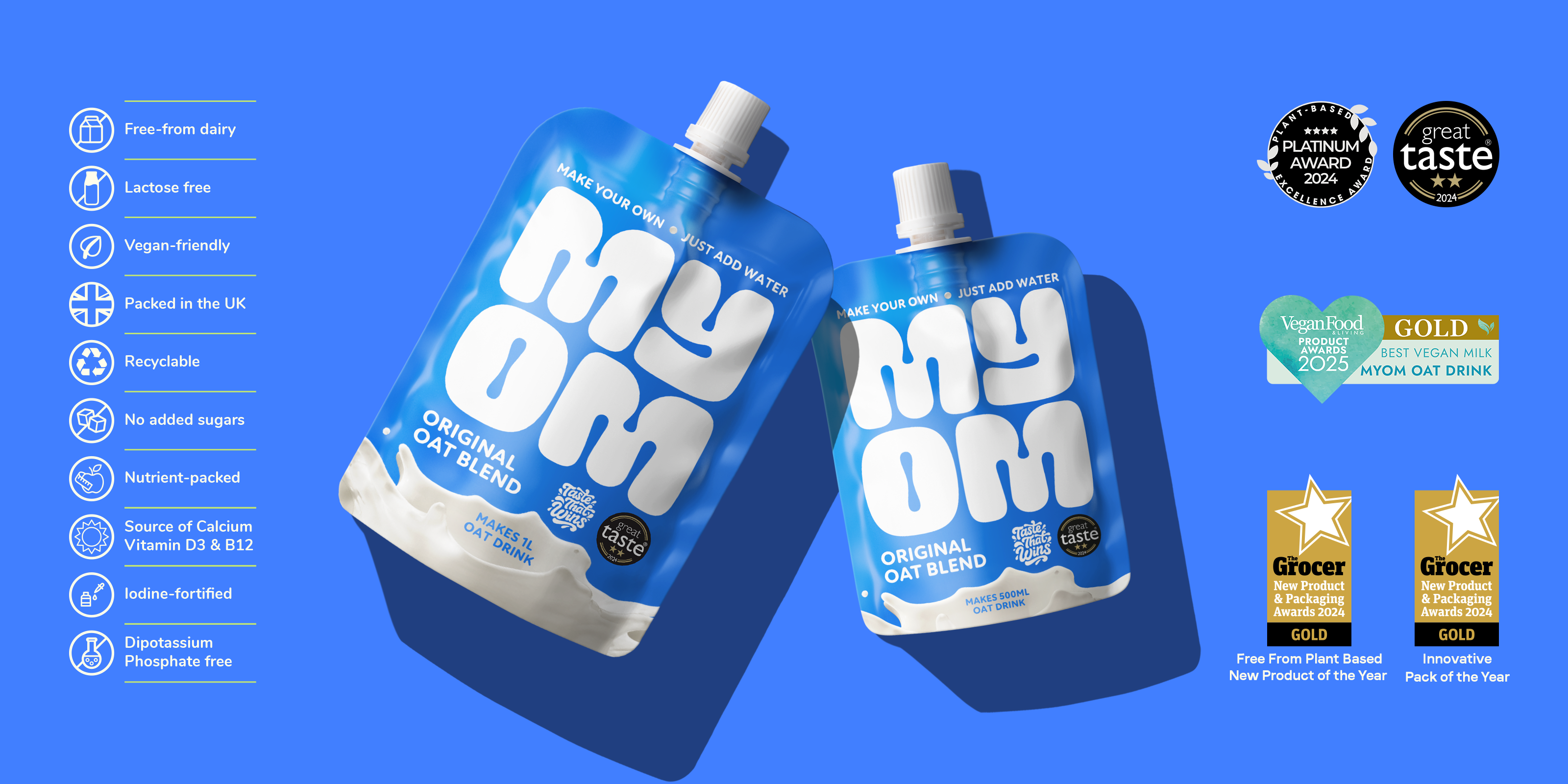 Made with 80% sustainably sourced oats, MYOM helps cut down on transport emissions, saves water, and reduces waste — a more eco-conscious alternative to dairy.