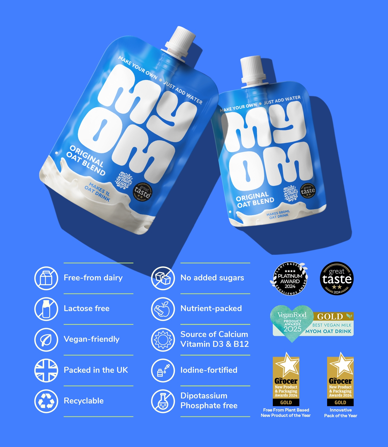 MYOM contains no artificial colours, flavours, sweeteners or preservatives. It’s also nut-free, soya-free, lactose-free and non-GMO, making it suitable for a wide range of dietary needs.